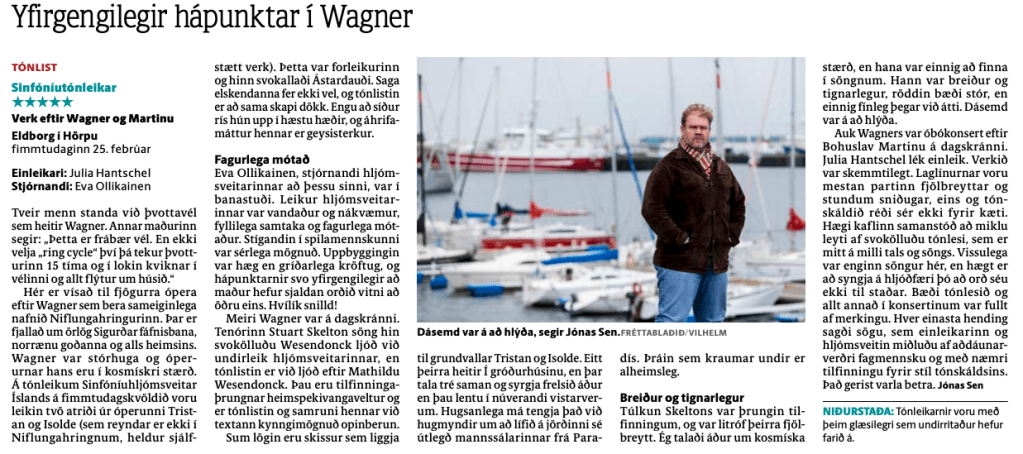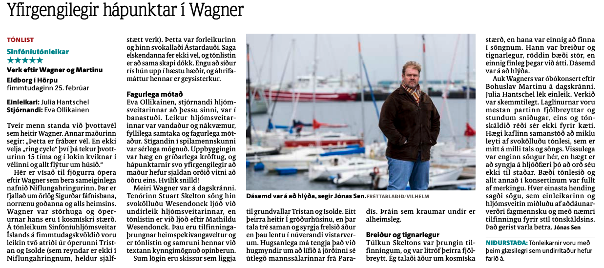 Auk Wagners var óbókonsert eftir Bohuslav Martinu á dagskránni. Julia Hantschel lék einleik. Verkið var skemmtilegt. Laglínurnar voru mestan partinn fjölbreyttar og stundum sniðugar, eins og tónskáldið réði sér ekki fyrir kæti. Hægi kaflinn samanstóð að miklu leyti af svokölluðu tónlesi, sem er mitt á milli tals og söngs. Vissulega var enginn söngur hér, en hægt er að syngja á hljóðfæri þó að orð séu ekki til staðar. Bæði tónlesið og allt annað í konsertinum var fullt af merkingu. Hver einasta hending sagði sögu, sem einleikarinn og hljómsveitin miðluðu af aðdáunarverðri fagmennsku og með næmri tilfinningu fyrir stíl tónskáldsins. Það gerist varla betra.