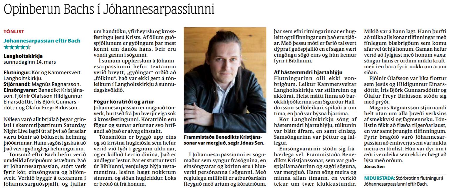 Magnús Ragnarsson stjórnandi hélt utan um alla þræði verksins af smekkvísi og fagmennsku. Tónlistinni fékk að flæða tilgerðarlaust, en var samt þrungin tilfinningum. Fyrir bragðið varð Jóhannesarpassían að einhverju sem var miklu meira en tónlist. Hún var dyr inn í æðri veruleika sem ekki er hægt að lýsa með orðum.