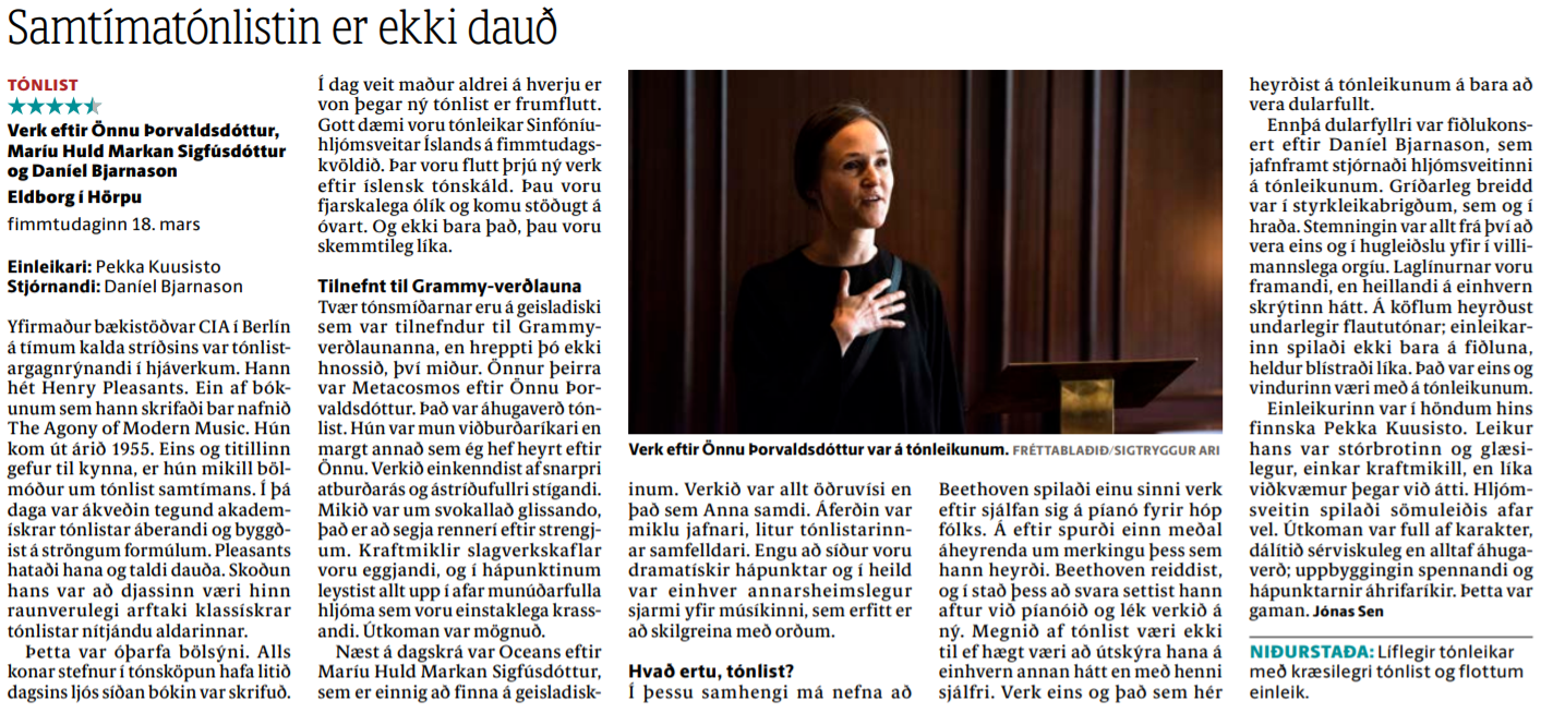 Þetta var óþarfa bölsýni. Alls konar stefnur í tónsköpun hafa litið dagsins ljós síðan bókin var skrifuð. Í dag veit maður aldrei á hverju er von þegar ný tónlist er frumflutt. Gott dæmi voru tónleikar Sinfóníuhljómsveitar Íslands á fimmtudagskvöldið. Þar voru flutt þrjú ný verk eftir íslensk tónskáld. Þau voru fjarskalega ólík, og komu stöðugt á óvart. Og ekki bara það, þau voru skemmtileg líka.