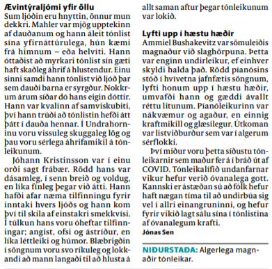 Ammiel Bushakevitz var sömuleiðis magnaður við slaghörpuna. Þetta var enginn undirleikur, ef einhver skyldi halda það. Rödd píanósins stóð í hvívetna jafnfætis söngnum, lyfti honum upp í hæstu hæðir, umvafði hann og gæddi ávallt réttu litunum. Píanóleikurinn var nákvæmur og agaður, en einnig kraftmikill og glæsilegur. Útkoman var listviðburður sem var í algerum sérflokki.