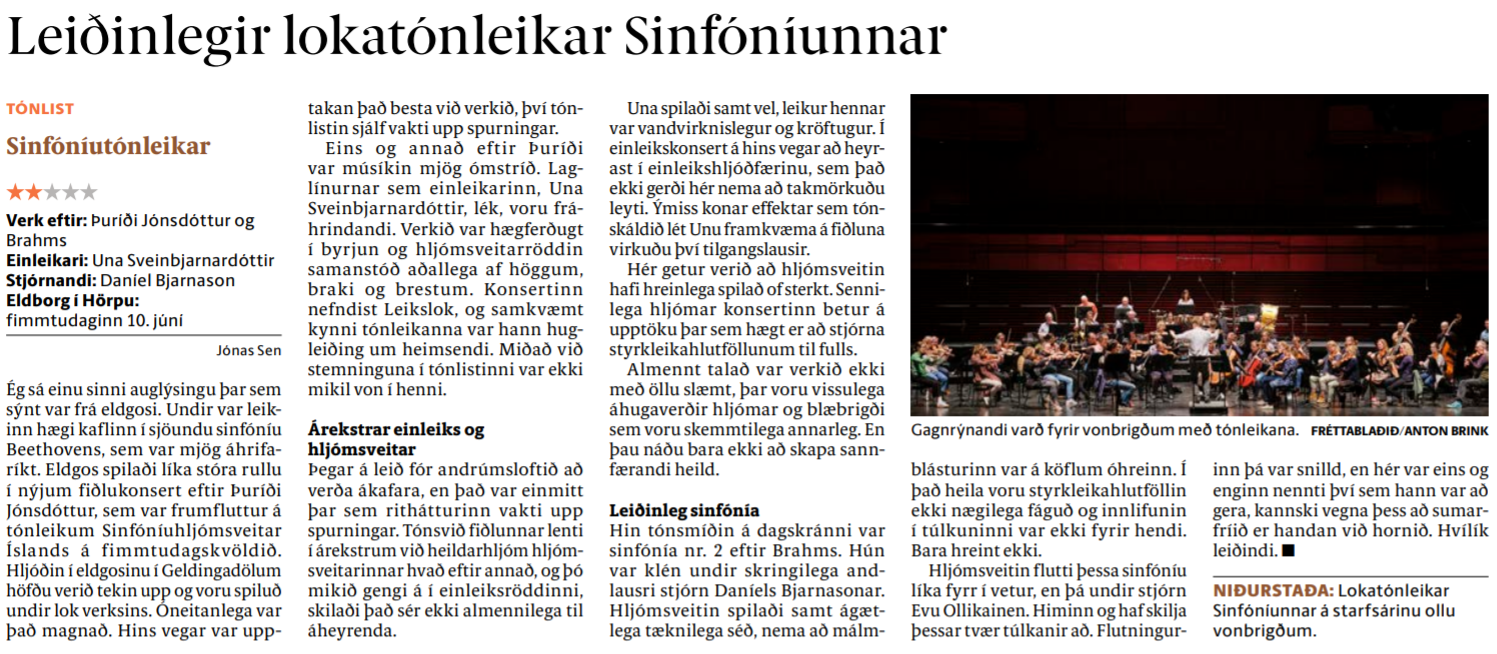 Ég sá einu sinni auglýsingu þar sem sýnt var frá eldgosi. Undir var leikinn hægi kaflinn í sjöundu sinfóníu Beethovens, sem var mjög áhrifaríkt. Eldgos spilaði líka stóra rullu í nýjum fiðlukonsert eftir Þuríði Jónsdóttur, sem var frumfluttur á tónleikum Sinfóníuhljómsveitar Íslands á fimmtudagskvöldið. Hljóðin í eldgosinu í Geldingadölum höfðu verið tekin upp og voru spiluð undir lok verksins. Óneitanlega var það magnað. Hins vegar var upptakan það besta við verkið, því tónlistin sjálf vakti upp spurningar.