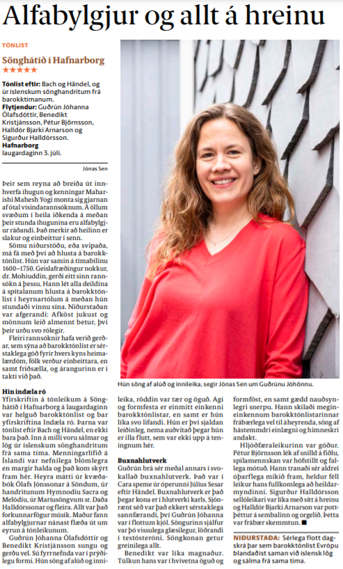 Yfirskriftin á tónleikum á Sönghátíð í Hafnarborg á laugardaginn var helguð barokktónlist og bar yfirskriftina Indæla ró. Þarna var tónlist eftir Bach og Händel, en ekki bara það. Inn á milli voru sálmar og lög úr íslenskum sönghandritum frá sama tíma. Menningarlífið á Íslandi var nefnilega blómlegra en margir halda og það kom skýrt fram hér. Heyra mátti úr kvæðabók Ólafs Jónssonar á Söndum, úr handritunum Hymnodiu Sacra og Melódíu, úr Maríusöngvum sr. Daða Halldórssonar og fleiru. Allt var það forkunnarfögur músík. Maður fann alfabylgurnar nánast flæða út um eyrun á tónleikunum.