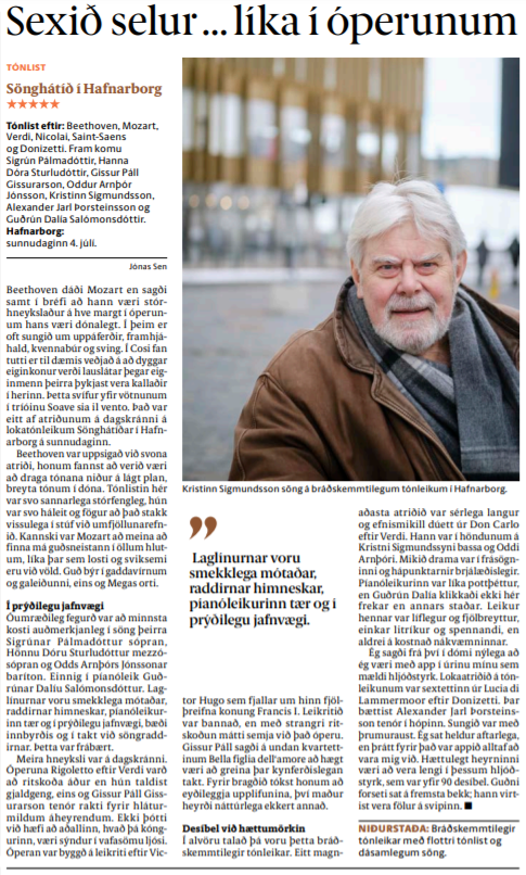 Beethoven dáði Mozart en sagði samt í bréfi að hann væri stórhneykslaður á hve margt í óperunum hans væri dónalegt. Í þeim er oft sungið um uppáferðir, framhjáhald, kvennabúr og sving. Í Cosi fan tutti er t.d. veðjað á að dyggar eiginkonur verði lauslátar þegar eiginmenn þeirra þykjast vera kallaðir í herinn. Þetta svífur yfir vötnunum í tríóinu Soave sia il vento. Það var eitt af atriðunum á dagskránni á lokatónleikum Sönghátíðar í Hafnarborg á sunnudaginn.