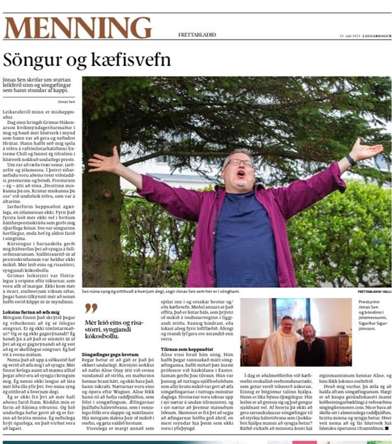 Í dag er aðalmeðferðin við kæfisvefni svokallað svefnöndunartæki, sem getur verið töluverð áskorun. Einnig er bitgómur talinn hjálpa. Hann er líka býsna óþægilegur. Hin leiðin er að grenna sig og það gengur sjaldnast vel. Afhverju þá ekki að gera sársaukalausar söngæfingar til að styrkja hálsvöðvana sem í þokkabót hjálpa manni að syngja betur? Ráðið virkaði a.m.k hjá eiginmanninum hennar Alise, og hún fékk loksins svefnfrið.