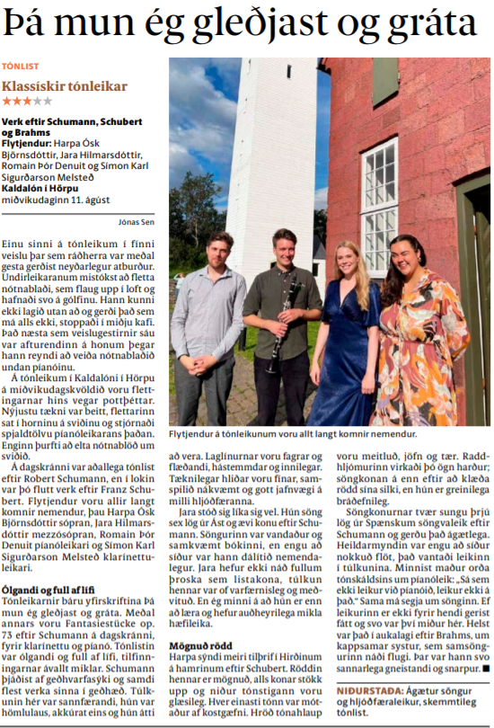 Tónleikarnir báru yfirskriftina Þá mun ég gleðjast og gráta. Meðal annars voru Fantasiestücke op. 73 eftir Schumann á dagskránni, fyrir klarinettu og píanó. Tónlistin var ólgandi og full af lífi, tilfinningarnar ávallt miklar. Schumann þjáðist af geðhvarfasýki og samdi flest verka sinna í geðhæð. Túlkunin hér var sannfærandi, hún var hömlulaus, akkúrat eins og hún átti að vera. Laglínurnar voru fagrar og flæðandi, hástemmdar og innilegar. Tæknilegar hliðar voru fínar, samspilið nákvæmt og gott jafnvægi á milli hljóðfæranna.