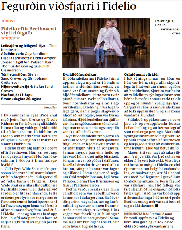 Fidelio er einnig nafnið á óperu eftir Beethoven. Hún var sett upp í mjög styttri mynd í Norðurljósasalnum í Hörpu á fimmtudagskvöldið. Ólíkt Eyes Wide Shut er aðalpersónan í óperunni trú manni sínum, en hún bregður sér í dulargervi til að frelsa hann úr fangelsi. Í Eyes Wide Shut eru líka allir dulbúnir í kynlífsklúbbnum, en dulargervið í Fidelio er lítt sannfærandi. Þetta er dæmigert fyrir svo margt sem er fjarstæðukennt í heimi óperunnar. Í La Traviata syngur kona með berkla af þrumuraust alveg fram í andlátið. Í Fidelio – eins og hún var færð upp hér – þurfti aðalpersónan bara að setja á sig húfu til að enginn þekkti hana.