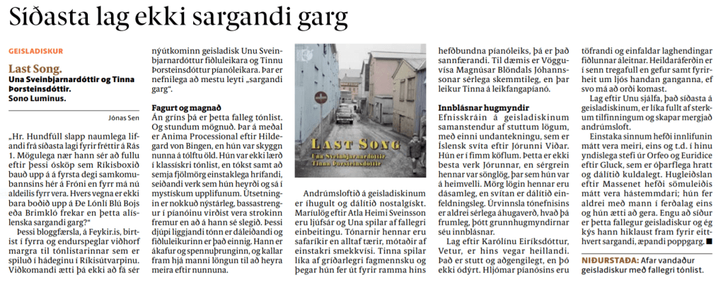 Þessi bloggfærsla, á Feykir.is, birtist í fyrra og endurspeglar viðhorf margra til tónlistarinnar sem er spiluð í hádeginu í Ríkisútvarpinu. Viðkomandi ætti þá ekki að fá sér nýútkominn geisladisk Unu Sveinbjarnardóttur fiðluleikara og Tinnu Þorsteinsdóttur píanóleikara. Þar er nefnilega að mestu leyti „sargandi garg.“