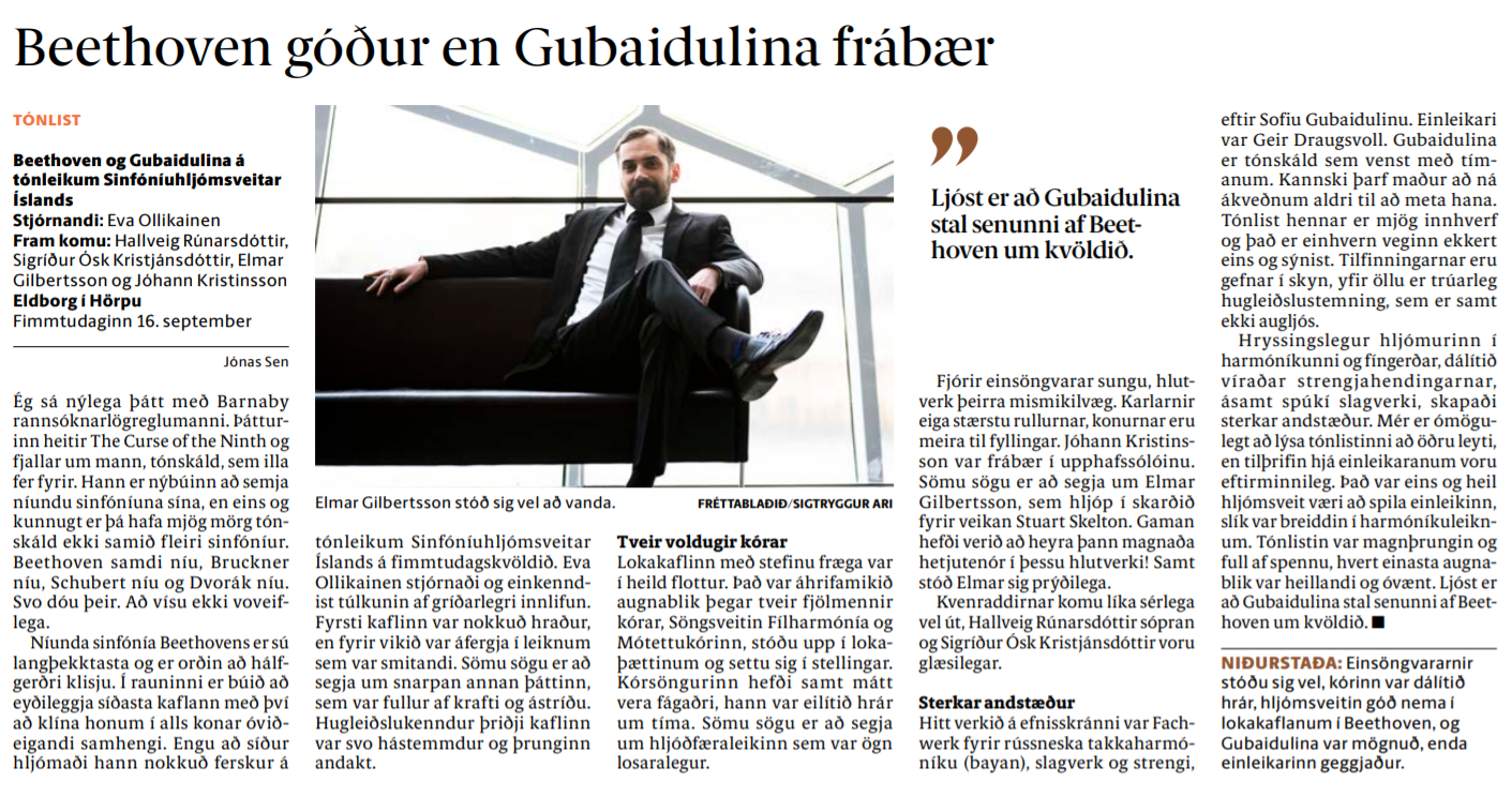 Beethoven og Gubaidulina á tónleikum Sinfóníuhljómsveitar Íslands. Eva Ollikainen stjórnaði. Fram komu Hallveig Rúnarsdóttir, Sigríður Ósk Kristjánsdóttir, Elmar Gilbertsson og Jóhann Kristinsson.