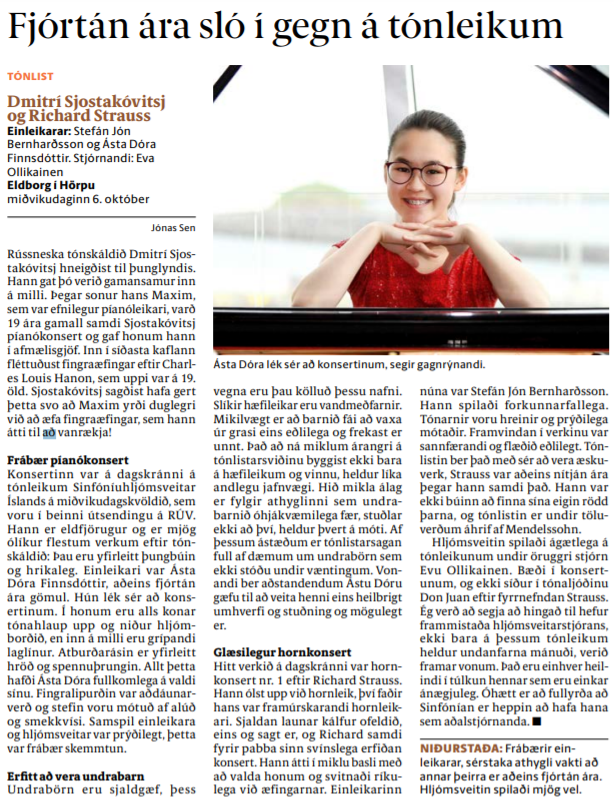 Niðurstaða: Frábærir einleikarar, sérstaka athygli vakti að annar þeirra er aðeins fjórtán ára. Hljómsveitin spilaði mjög vel.