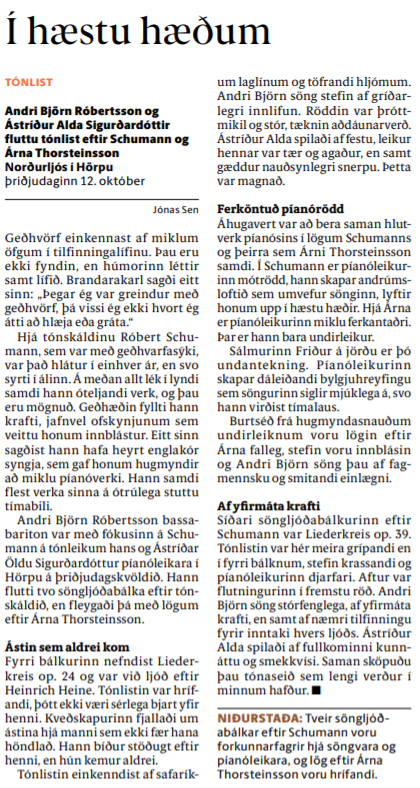 Síðari söngljóðabálkurinn eftir Schumann var Liederkreis op. 39. Tónlistin var hér meira grípandi en í fyrri bálknum, stefin krassandi og píanóleikurinn djarfari. Aftur var flutningurinn í fremstu röð. Andri Björn söng stórfenglega, af yfirmáta krafti, en samt af næmri tilfinningu fyrir inntaki hvers ljóðs. Ástríður Alda spilaði af fullkominni kunnáttu og smekkvísi. Saman sköpuðu þau tónaseið sem lengi verður í minnum hafður.