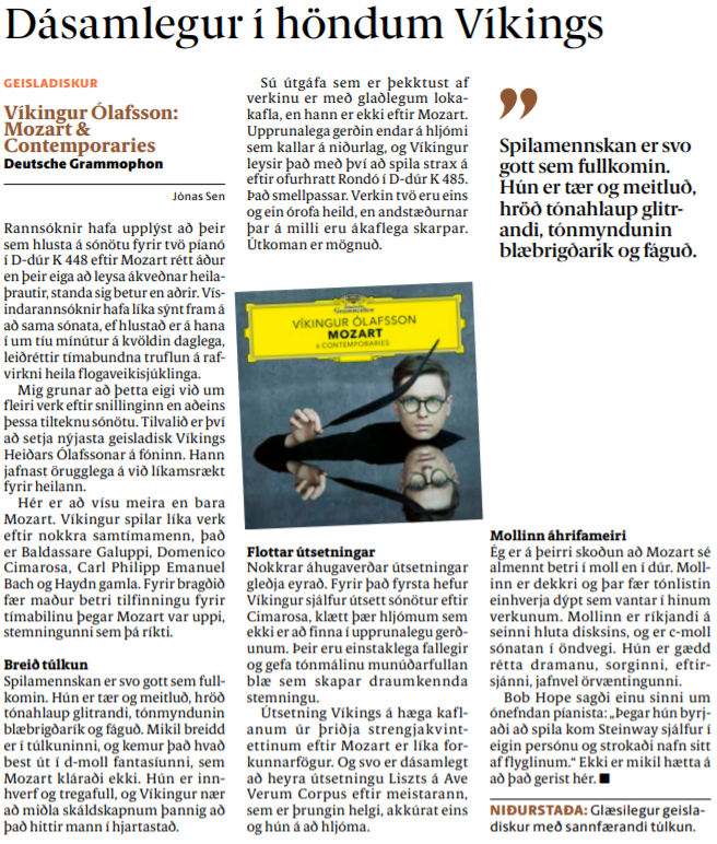 Spilamennskan er svo gott sem fullkomin. Hún er tær og meitluð, hröð tónahlaup glitrandi, tónmyndunin blæbrigðarík og fáguð. Mikil breidd er í túlkuninni, og kemur það hvað best út í d-moll fantasíunni, sem Mozart kláraði ekki. Hún er innhverf og tregafull, og Víkingur nær að miðla skáldskapnum þannig að það hittir mann í hjartastað.