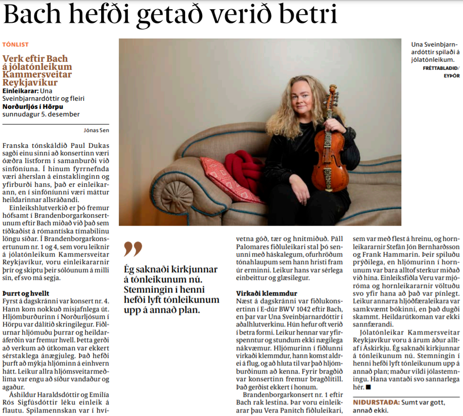 Næst á dagskránni var fiðlukonsertinn í E-dúr BWV 1042 eftir Bach, en þar var Una Sveinbjarnardóttir í aðalhlutverkinu. Hún hefur oft verið í betra formi. Leikur hennar var yfirspenntur og stundum ekki nægilega nákvæmur. Hljómurinn í fiðlunni virkaði klemmdur, hann komst aldrei á flug, og að hluta til var það hljómburðinum að kenna. Fyrir bragðið var konsertinn fremur bragðlítill. Það gerðist ekkert í honum.