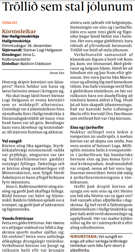 Þetta eru góðu fréttirnar. Þær slæmu eru að þegar nokkuð var liðið á dagskrána spurði maður sjálfan sig: Dó einhver? Þetta voru nefnilega afskaplega drungalegir tónleikar. Verkefnaval kórsins var þungt og túlkunin heilt yfir var þrungin alvöru sem jaðraði við helgislepju. Stemningin var eins og í jarðarför. Jólin eru samt tími gleði og fögnuðar þegar ljósið fæðist inn í heiminn. Hér voru engar gleðifréttir, bara tíðindi af yfirvofandi heimsendi. Tröllið var búið að stela jólunum.