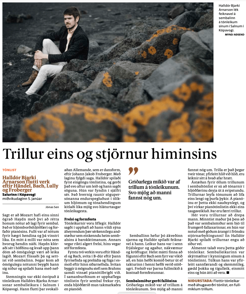 Stemningin var ekki ósvipuð á tónleikum Halldórs Bjarka Arnarsonar semballeikara í Salnum í Kópavogi. Hann flutti þar svokallaðan Allemande, sem er dansform, eftir Johann Jakob Froberger. Með laginu fygdi saga. Halldór spilaði fyrst eingöngu tónlistina, og gerði það svo aftur um leið og hann sagði söguna. Hún var fyndin í sjálfri sér. Það hvernig raunir sögupersónanna endurspegluðust í ólíkum hljómum og tónahendingum kitlaði líka mjög svo hláturtaugar tónleikagesta.