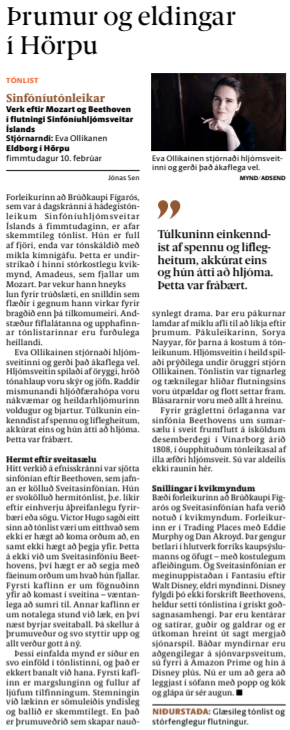 Eva Ollikainen stjórnaði hljómsveitinni og gerði það ákaflega vel. Hljómsveitin spilaði af öryggi, hröð tónahlaup voru skýr og jöfn. Raddir mismunandi hljóðfærahópa voru nákvæmar, og heildarhljómurinn voldugur og bjartur. Túlkuninn einkenndist af spennu og líflegheitum, akkúrat eins og hún átti að hljóma. Þetta var frábært.