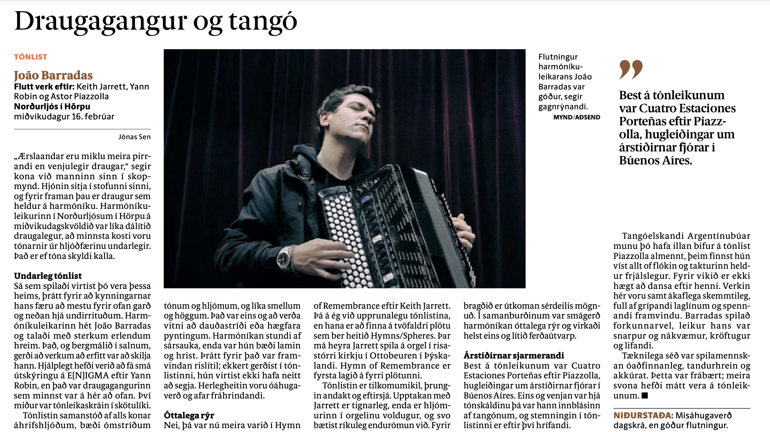 Sá sem spilaði virtist þó vera þessa heims, þrátt fyrir að kynningarnar hans færu að mestu fyrir ofan garð og neðan hjá undirrituðum. Harmóníkuleikarinn hét João Barradas og talaði með sterkum erlendum hreim. Það, og bergmálið í salnum, gerði að verkum að erfitt var að skilja hann. Hjálplegt hefði verið að fá smá útskýringu á E[N]IGMA eftir Yann Robin, en það var draugagangurinn sem minnst var á hér að ofan. Því miður var tónleikaskráin í skötulíki.