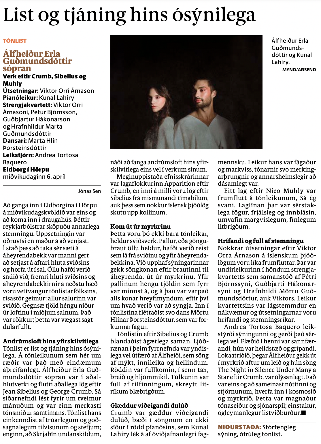 Tónlist er list og tjáning hins ósýnilega. Á tónleikunum sem hér um ræðir var það með eindæmum áþreyfanlegt. Álfheiður Erla Guðmundsdóttir sópran var í aðalhlutverki og flutti aðallega lög eftir Jean Sibelius og George Crumb. Sá síðarnefndi lést fyrir um tveimur mánuðum og var einn merkasti tónsmiður samtímans. Tónlist hans einkenndist af trúarlegum og goðsagnalegum tilvísunum og stefjum; enginn, að Skrjabín undanskildum, náði að fanga andrúmsloft hins yfirskilvitlega eins vel í verkum sínum.