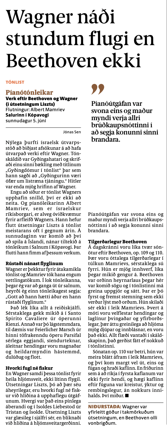 Engu að síður er tónlist Wagners upphafin snilld, því er ekki að neita. Og píanóleikarinn Albert Mamriev, sem er ísraelskur ríkisborgari, er alveg óviðkvæmur fyrir arfleifð Wagners. Hann hefur flutt útsetningar Liszts á tónlist meistarans oft í gegnum árin. Á sunnudaginn var komið að því að spila á Íslandi, nánar tiltekið á tónleikum í Salnum í Kópavogi. Þar flutti hann fimm af þessum verkum.
