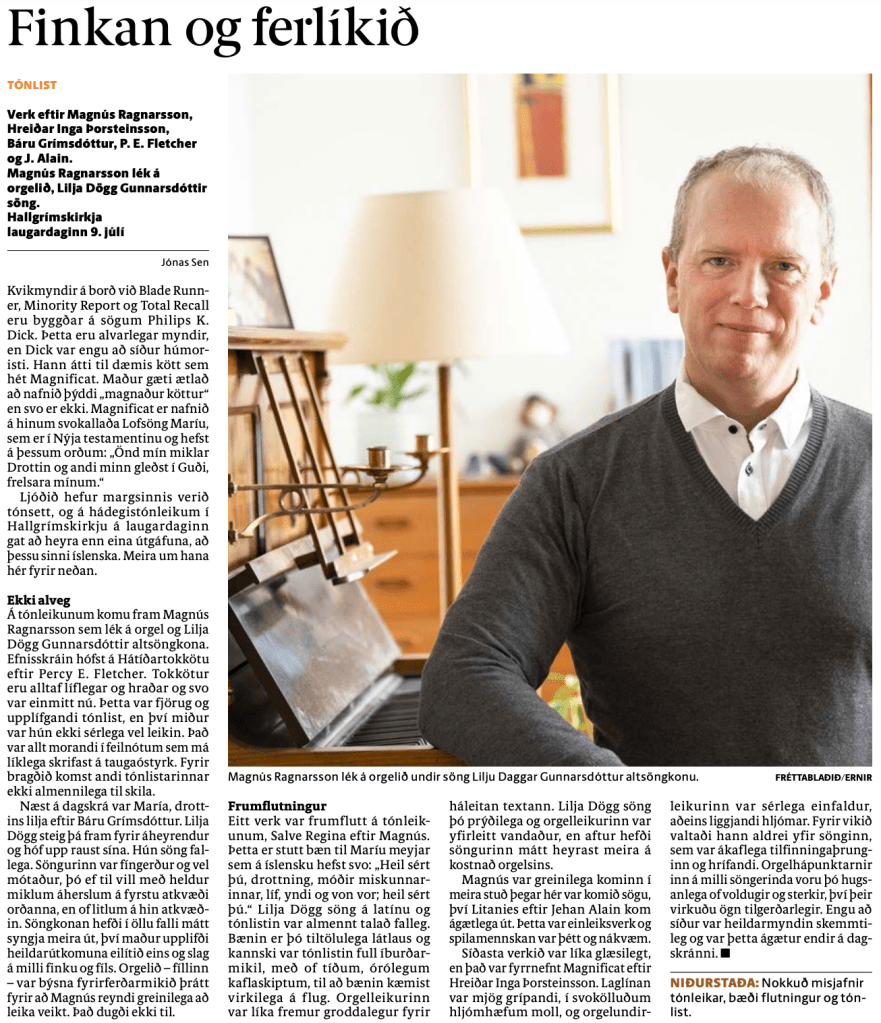 Síðasta verkið var líka glæsilegt, en það var fyrrnefnt Magnificat eftir Hreiðar Inga Þorsteinsson. Laglínan var mjög grípandi, í svokölluðum hljómhæfum moll, og orgelundirleikurinn var sérlega einfaldur, aðeins liggjandi hljómar. Fyrir vikið valtaði hann aldrei yfir sönginn, sem var ákaflega tilfinningaþrunginn og hrífandi. Orgelhápunktarnir inn á milli söngerinda voru þó hugsanlega of voldugir og sterkir, því þeir virkuðu ögn tilgerðarlegir. Engu að síður var heildarmyndin skemmtileg og var þetta ágætur endir á dagskránni.