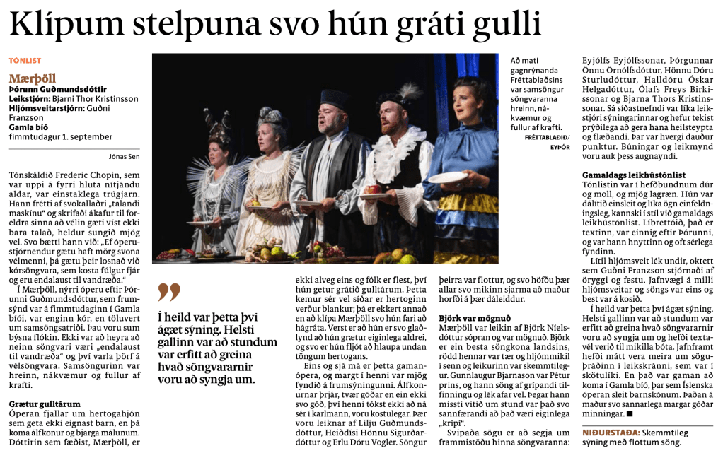Mærþöll var leikin af Björk Níelsdóttur sópran og var mögnuð. Björk er ein besta söngkona landsins, rödd hennar var tær og hljómmikil í senn og leikurinn var skemmtilegur. Gunnlaugur Bjarnason var Pétur prins, og hann söng af grípandi tilfinningu og lék afar vel. Þegar hann missti vitið um stund var það svo sannfærandi að það væri eiginlega „krípí“.