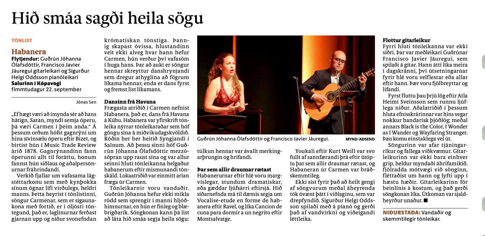 Fyrri hluti tónleikanna var ekki síðri. Þar var meðleikari Guðrúnar Francisco Javier Jáuregui, sem spilaði á gítar. Hann átti líka meira í dagskránni, því útsetningarnar fyrir hlé voru velflestar eða allar eftir hann. Þær voru fjölbreyttar og lifandi.