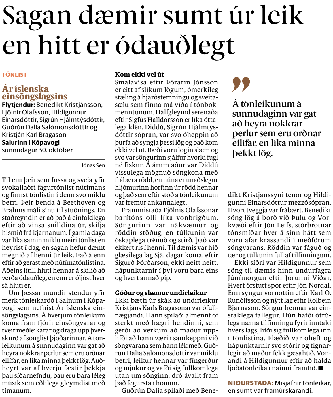 Guðrún Dalía spilaði með Benedikt Kristjánssyni tenór og Hildigunni Einarsdóttur mezzósópran. Hvort tveggja var frábært. Benedikt söng lög á borð við Þulu og Vorkvæði eftir Jón Leifs, bæði stórbrotnar tónsmíðar hver á sinn hátt sem voru afar krassandi í meðförum söngvarans. Röddin var fáguð og tær og túlkunin full af tilfinningum.